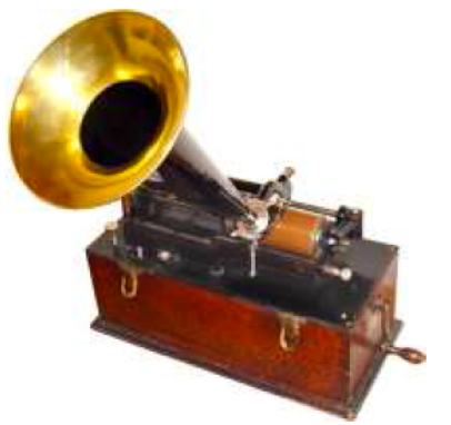 Thomas Edison grave le son sur un cylindre de cire. Une aiguille suit les sillons et fait vibrer un pavillon.