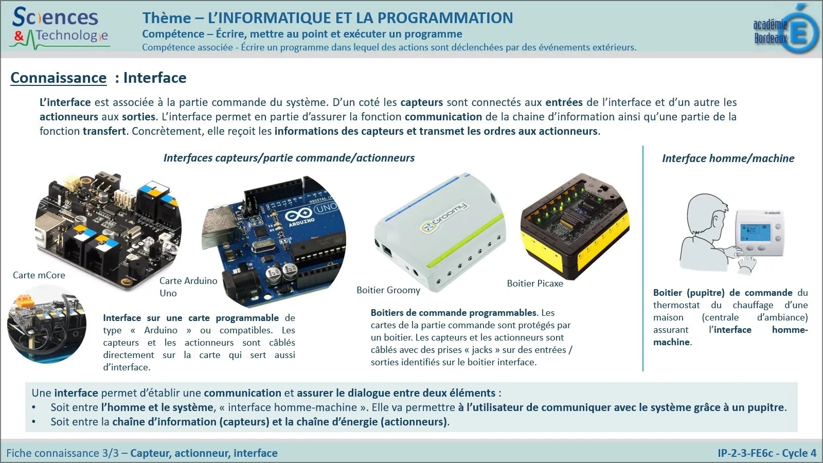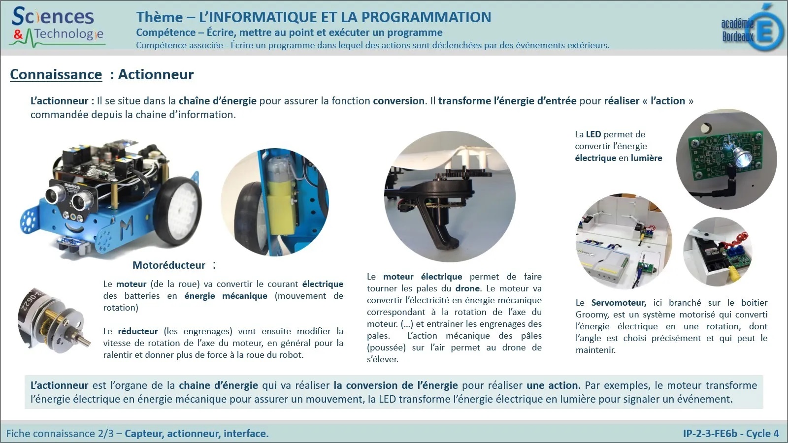 | ⚙ Actionneur | Composant qui agit sur l'environnement (moteur, LED, buzzer...) selon les ordres de la partie commande. C'est une sortie d'information. |