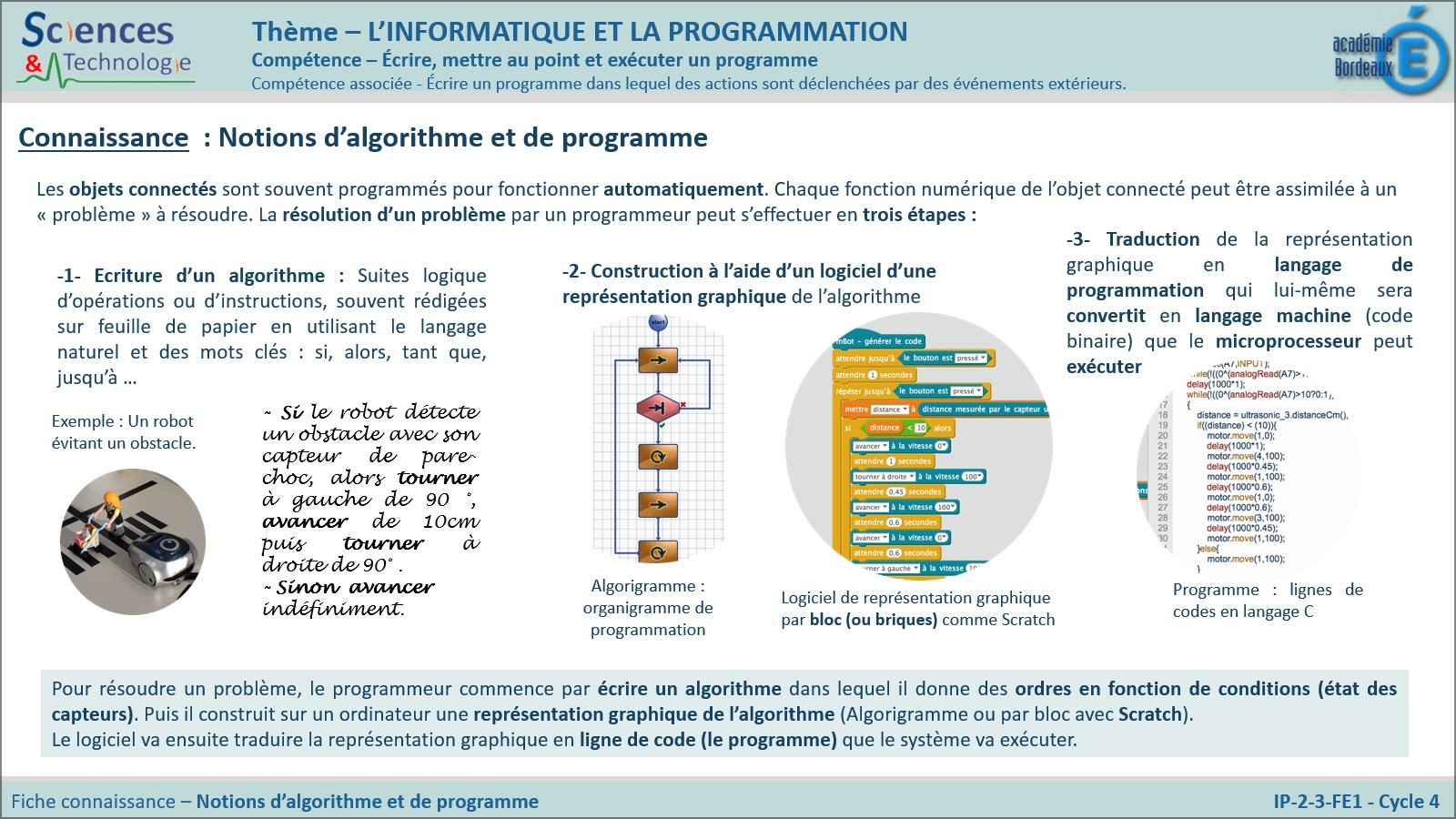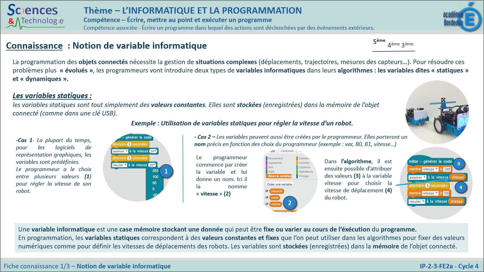 Ces fiches de synthèse portent sur les notions d'algorithme, de programme, de variable statique et d'écart entre attentes et résultats expérimentaux.