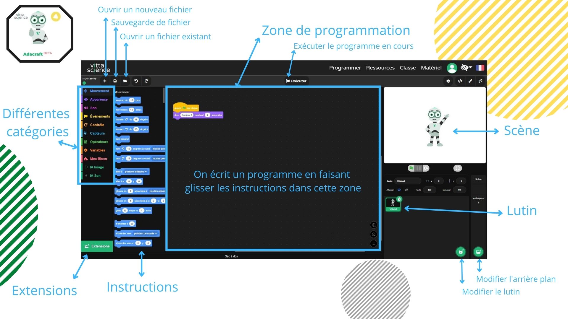 Tu dois intégrer ton modèle d'apprentissage créé avec Teachable Machine dans un programme informatique et afficher l'état émotionnel de la classe sur une carte micro:bit. Pour cela nous utiliserons l'application Vitta Science / Adacraft. Etape 1 : vérification du bon fonctionnement du modèle et interagir avec l'assistant virtuel